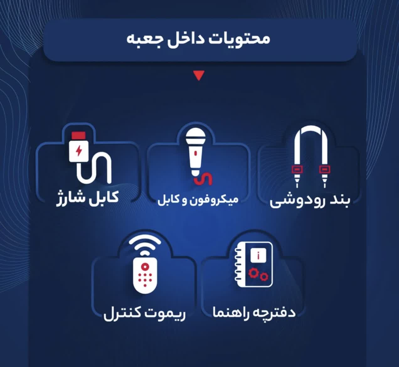 میکروفون و کابل میکروفون / بند دوشی/ دفترچه راهنما/ کابل شارژر/ ریموت کنترل